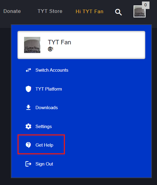 - Go to https://tyt.com/settings/help/email or select your Profile Picture in the upper right corner and select Get Help.