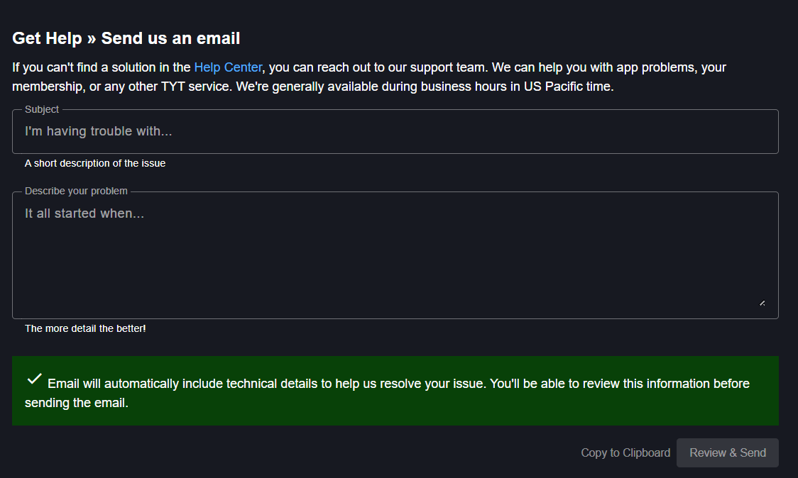 When you email us from Get Help on the TYT.com website or TYT app, the email will automatically include technical details that will help us to resolve your issue faster.