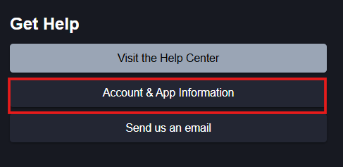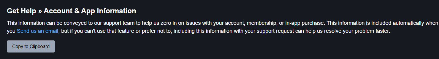 If you prefer not to use the Send Us an Email feature, or it isn't working for you, please use the Account and App Information button to copy the information to your clipboard.